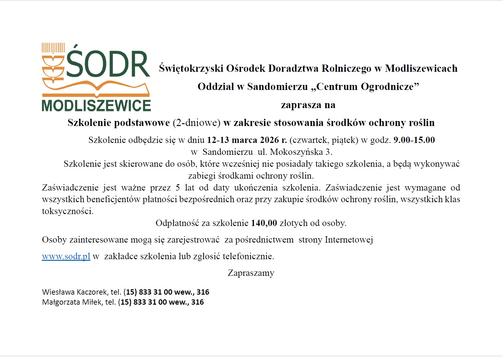 Szkolenie podstawowe (2-dniowe) w zakresie stosowania środków ochrony roślin