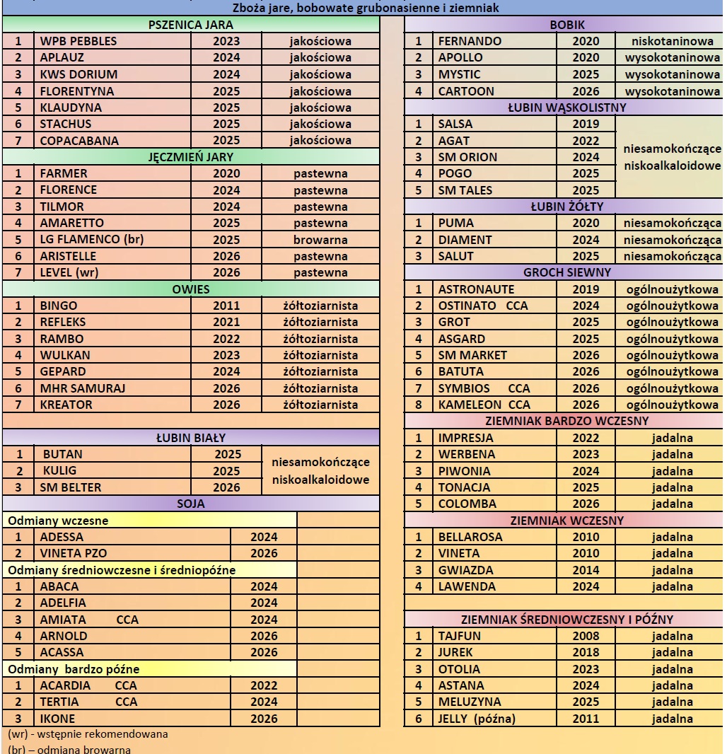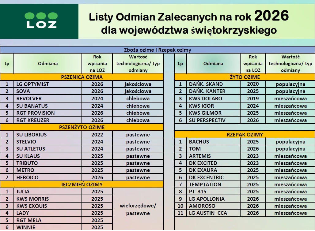 Lista odmian zalecanych zbóż ozimych i jarych, rzepaku, roślin bobowatych oraz ziemniaków na rok 2026 dla województwa świętokrzyskiego