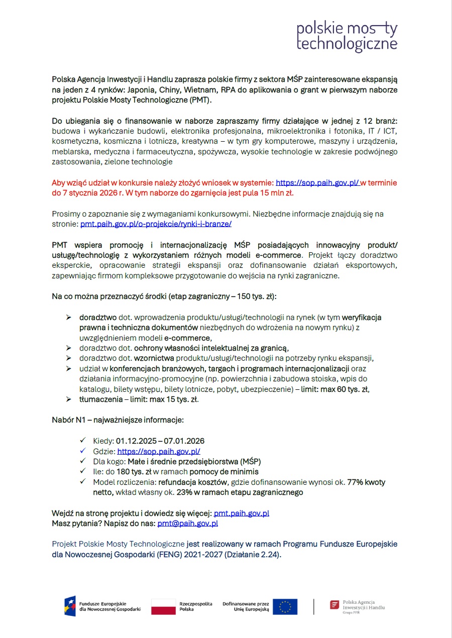 Nabór wniosków do projektu Polskie Mosty Technologiczne (PAIH) do 07.01.2026 roku